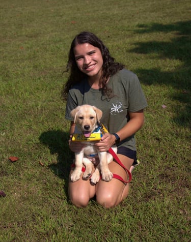Cricket is a petite lab/golden mix and was the club's first female pup, raised by Julia Ostrowski. After a change in career, Cricket was adopted back by her raiser on Valentine’s Day and is enjoying the pet life!