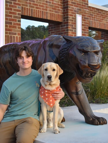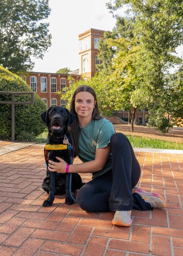 Baxter is a large black lab who was co-raised by Maddie Barrett and Anderson Reed. He graduated as a service dog with a facilitator in May 2024. Baxter now assists his handler by retrieving dropped items, opening doors, and guiding his partner in a wheelchair!
